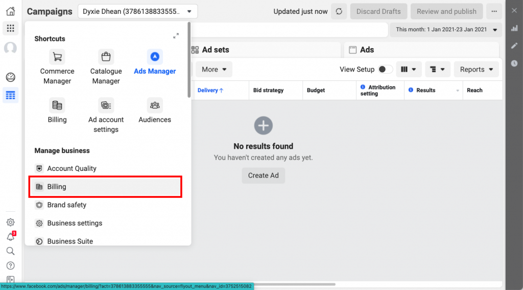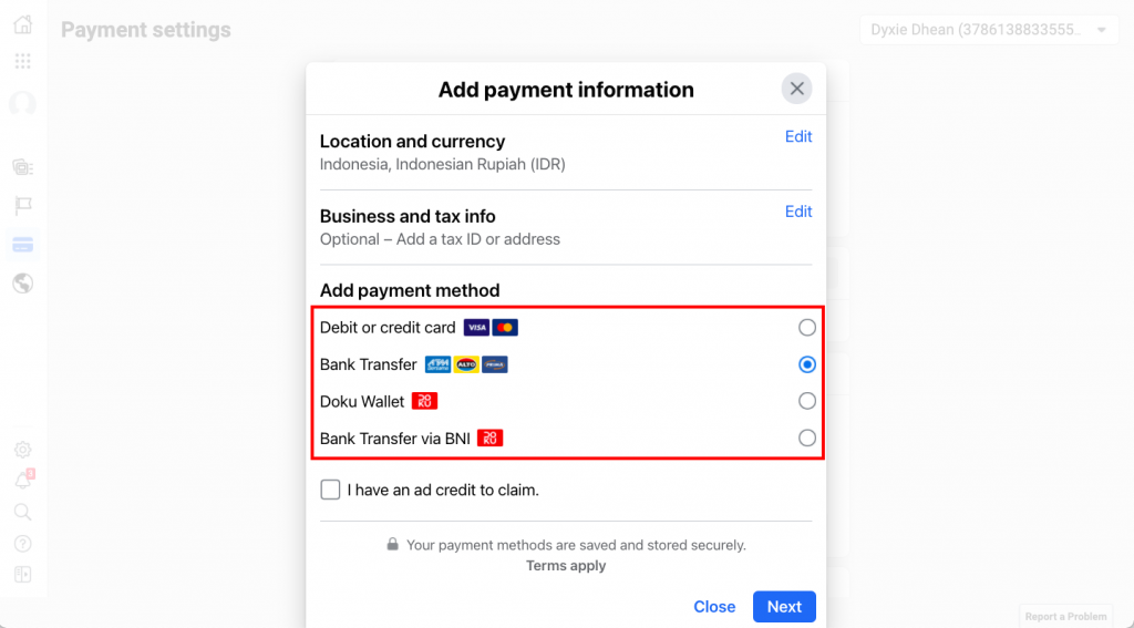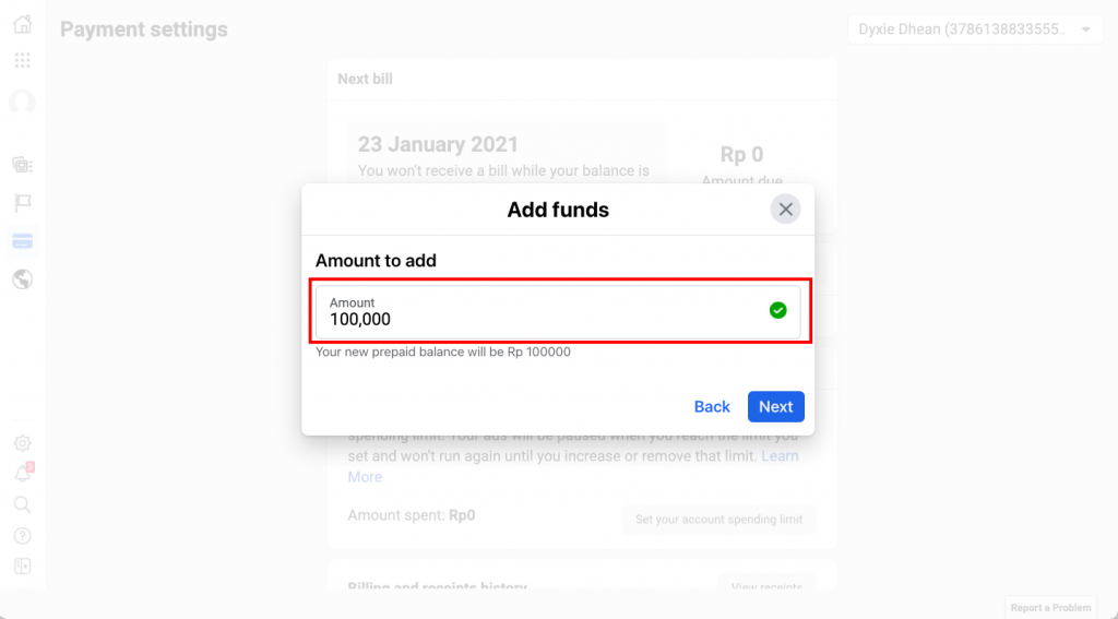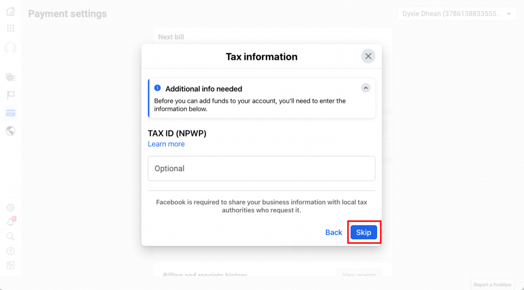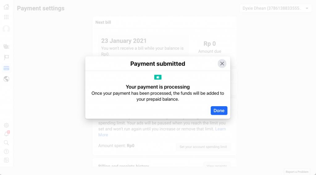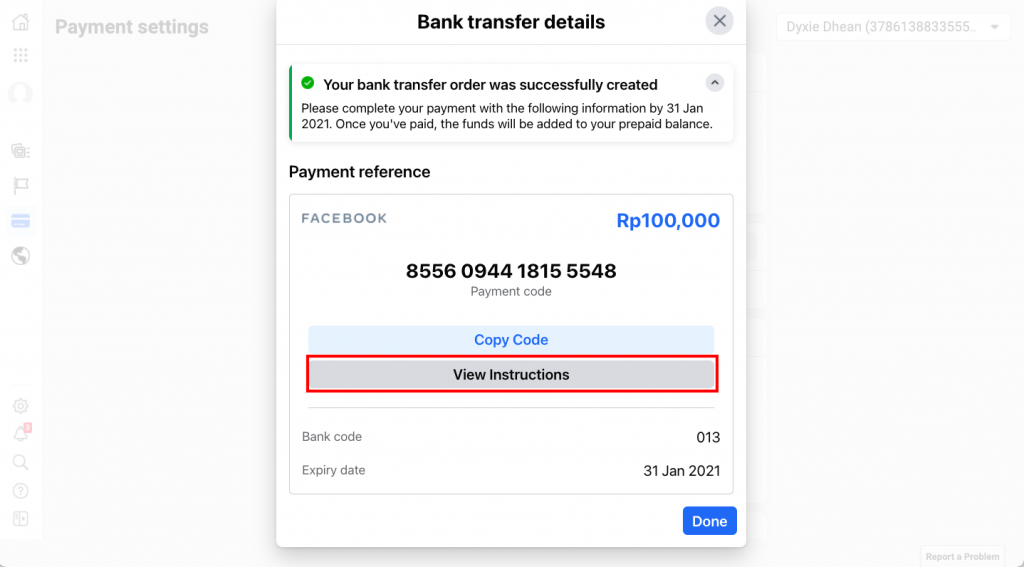 Kunjungi halaman facebook.com/ads/manager lalu klik tombol dial pad diatas. Setelah itu pilih billing Lalu kemudian masuk ke Payment Setting Lalu tambahkan Payment Method Pilih metode pembayaran Masukkan jumlah nominal saldo yang ingin di top up Untuk bagian NPWP, skip jika tidak memiliki atau boleh diisi bagi yang memiliki Setelah itu pada bagian ini klik View Instruction untuk instruksi cara pembayaran Kemudian pilih instruksinya dalam Bahasa Indonesia untuk lebih mudah memahami Setelah top up, maka klik done dan tunggu saldo terisi Bagikan artikel ini Share this content Opens in a new window Opens in a new window Opens in a new window Opens in a new window Opens in a new window Read more articles Previous PostBelajar buat website untuk pemula (tanpa coding) You Might Also Like Persyaratan Domain . ID December 24, 2019 Mengenal istilah hosting, website, domain & SSL October 25, 2019 Belajar buat website untuk pemula (tanpa coding) October 8, 2020
